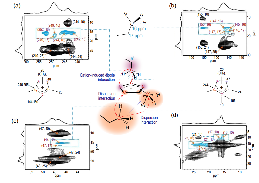 利用2D 13C-13C PDSD固体核磁共振技术取得H-ZSM-5分子筛上丙烷与环戊烯碳正离子间不同种类的客体-客体分子间相互作用信息