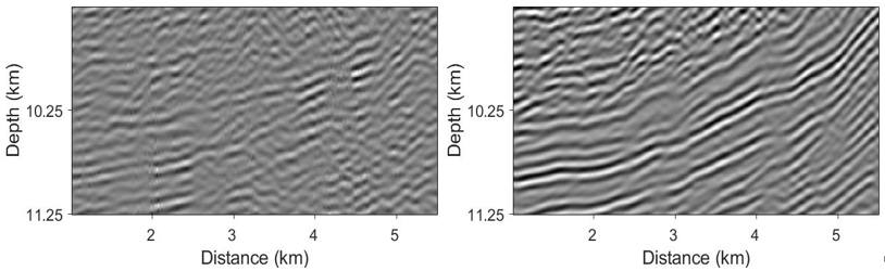 地震勘探经历了从二维走向三维,从叠后走向叠前,从时间域成像走向深度域成像的开展过程。然而,现在在工业界,仍缺乏在深度域直接进行反演的有效技术。现有方法无法满足精细储层解释的需要并计算量很大。针对上述问题,该团队开展了一种基于点扩散函数的深度域最小二乘反演方法,避免了“时深转换”的过程,大幅提高了反演效率。该方法可以有效地均衡照明,清晰刻画断层面,明显提升空间分辨率。并且计算量只有传统数据域最小二乘方法的1/10。